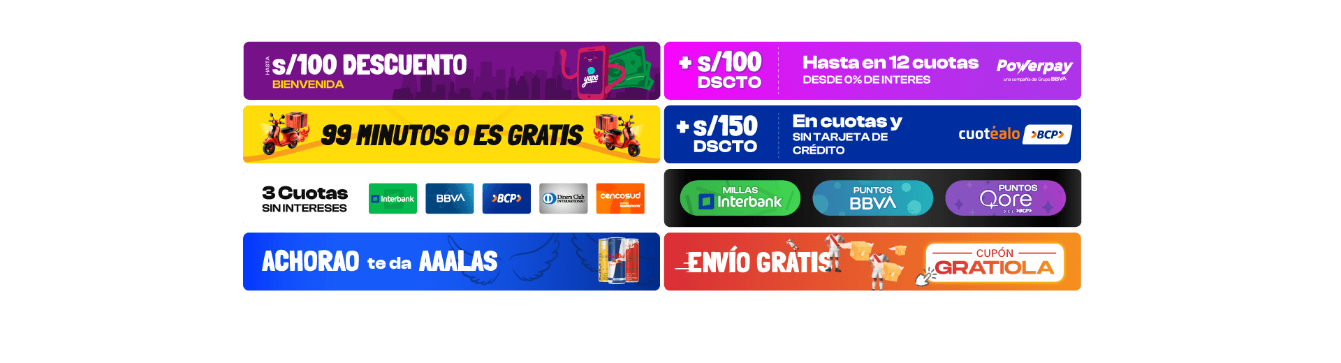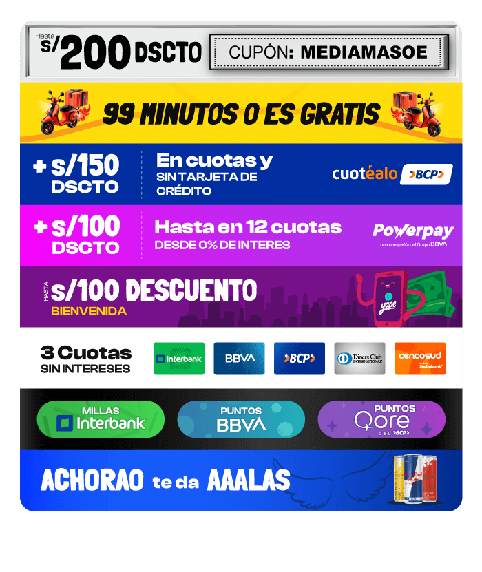 Beneficios y descuentos sujetos a disponibilidad de stock, zona de entrega, métodos de pago aplicables y condiciones establecidas en cada producto o campaña promocional. Las imágenes mostradas son referenciales. Las promociones pueden tener vigencia limitada y/o stock limitado y no son acumulables con otras promociones, salvo que se indique lo contrario. Los precios con descuento aplican al momento de realizar el pago y son calculados según el método de pago seleccionado. Pagos por transferencia, Yape/Plin u otros medios digitales directos aplican las tarifas preferenciales mostradas como “Precio transferencia / Yape / Plin”. Pagos con tarjeta de crédito y/o débito, incluyendo PowerPay, Mercado Pago, Cuotéalo BCP u otros medios de financiamiento, están sujetos a tasas y condiciones establecidas por las entidades financieras correspondientes. El beneficio de 99 minutos o es gratis aplica únicamente para zonas elegibles en Lima Metropolitana y pedidos validados dentro del horario operativo, conforme a los términos indicados en la página del producto. En pedidos fuera de cobertura o realizados fuera del horario operativo, aplicarán tiempos estándar de entrega. Antes de confirmar la compra, el cliente podrá ver el detalle de costos, cuotas disponibles, beneficios y restricciones según el método de pago elegido. El cliente es responsable de verificar que cualquier cupón o beneficio se encuentre activo y aplicable antes de completar el pago. Achorao se reserva el derecho de modificar o suspender las promociones sin previo aviso, respetando los beneficios previamente confirmados. Las promociones no son canjeables por dinero en efectivo, abonos en cuentas, ni otras compensaciones distintas a las indicadas. Para más información, términos y condiciones específicos y beneficios vigentes, visita: https://www.achorao.com/pages/promociones-y-beneficios