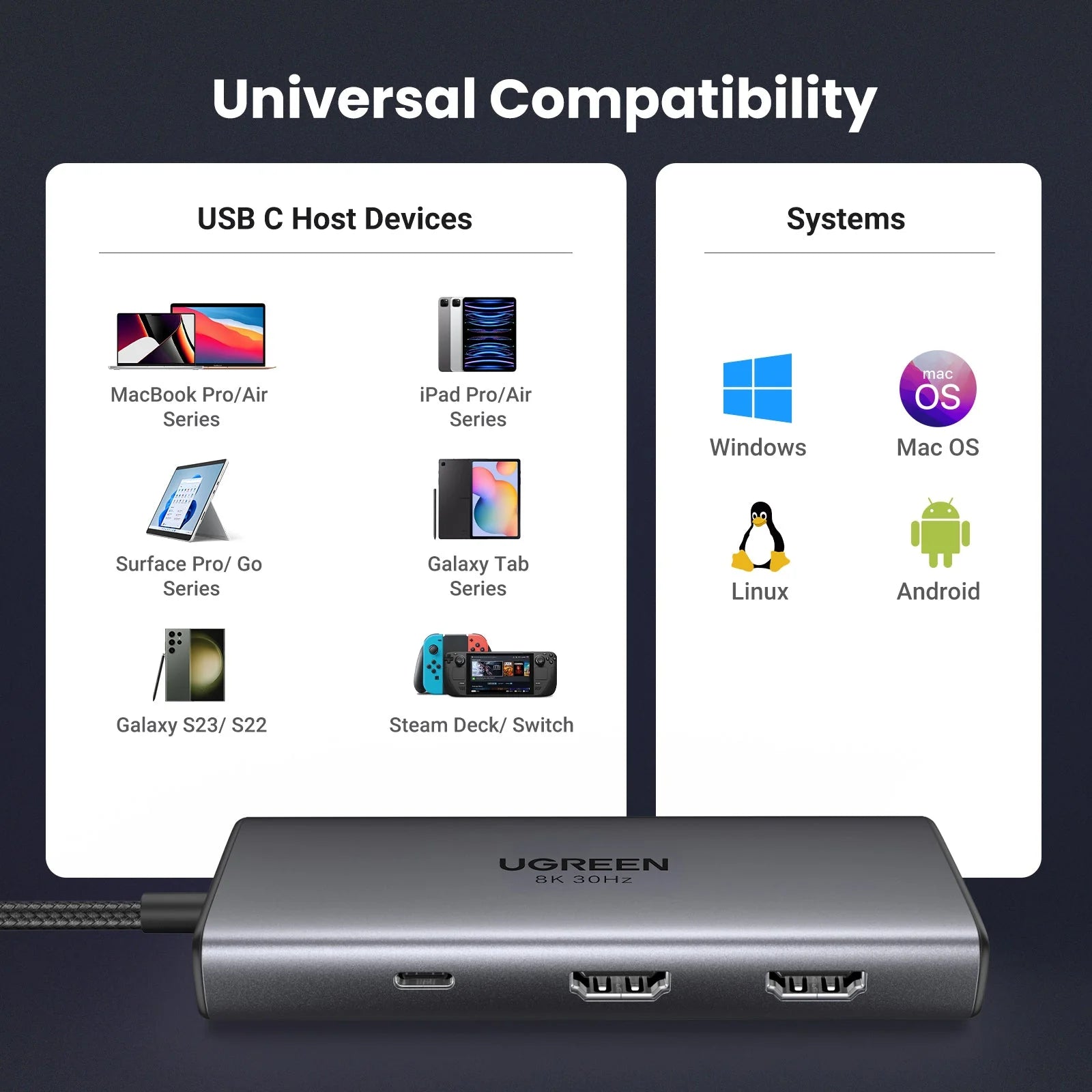 - Hub C USB 6 en 1: UGREEN USB C Hub dual HDMI ofrece conectividad 6 en 1 con dos puertos HDMI y más.