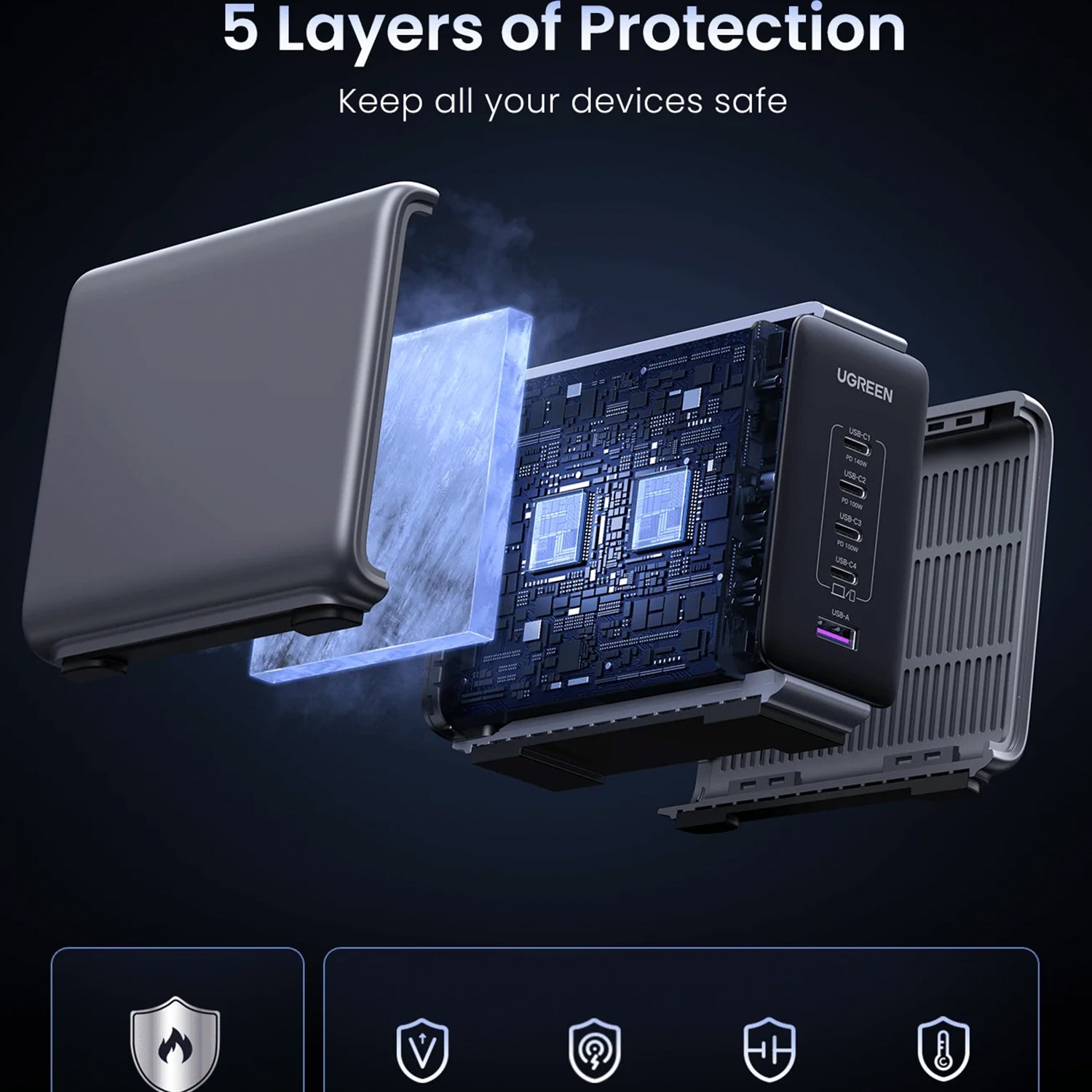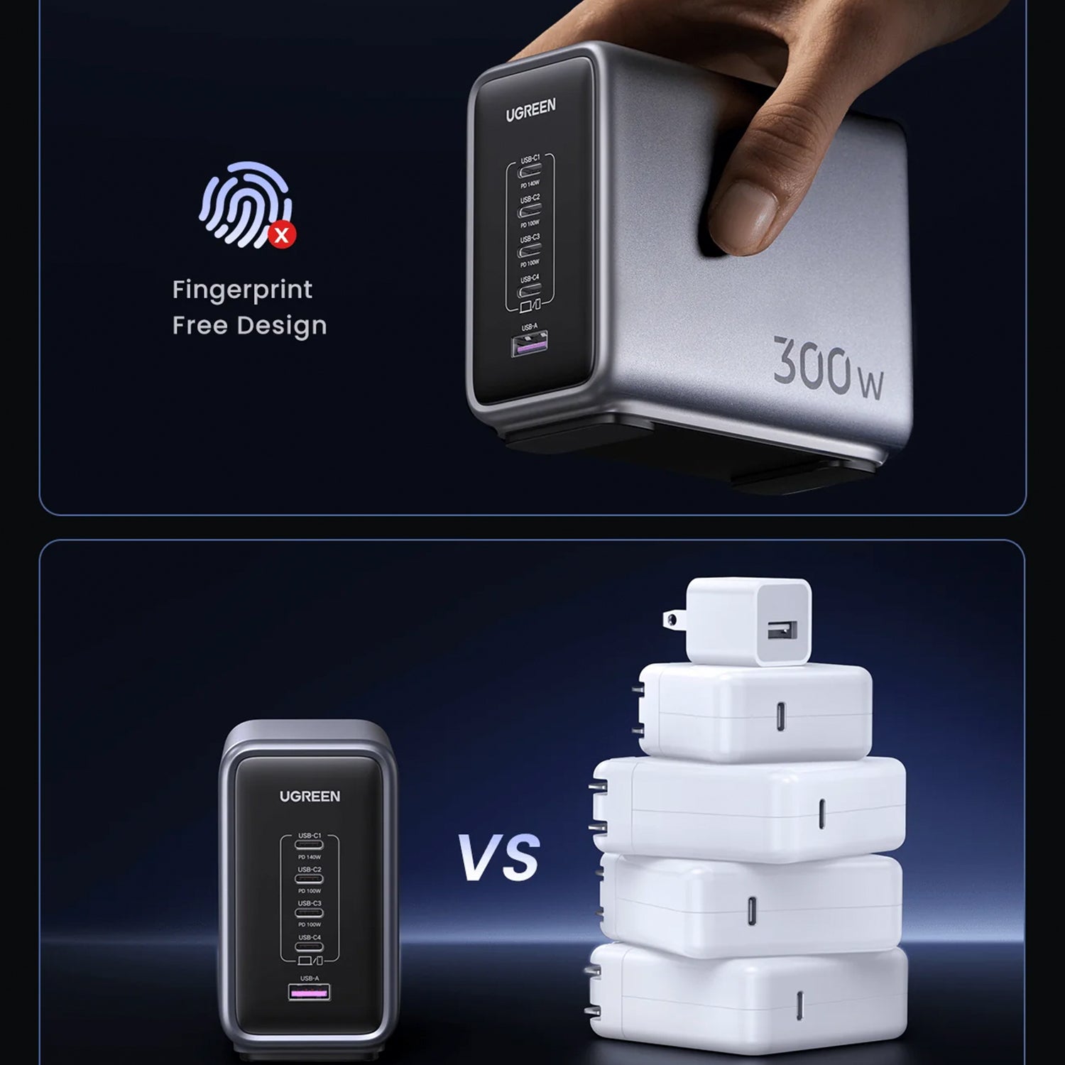 - Superpotencia de 300 W: Cargue hasta 5 dispositivos simultáneamente con una potencia máxima de 300 W.