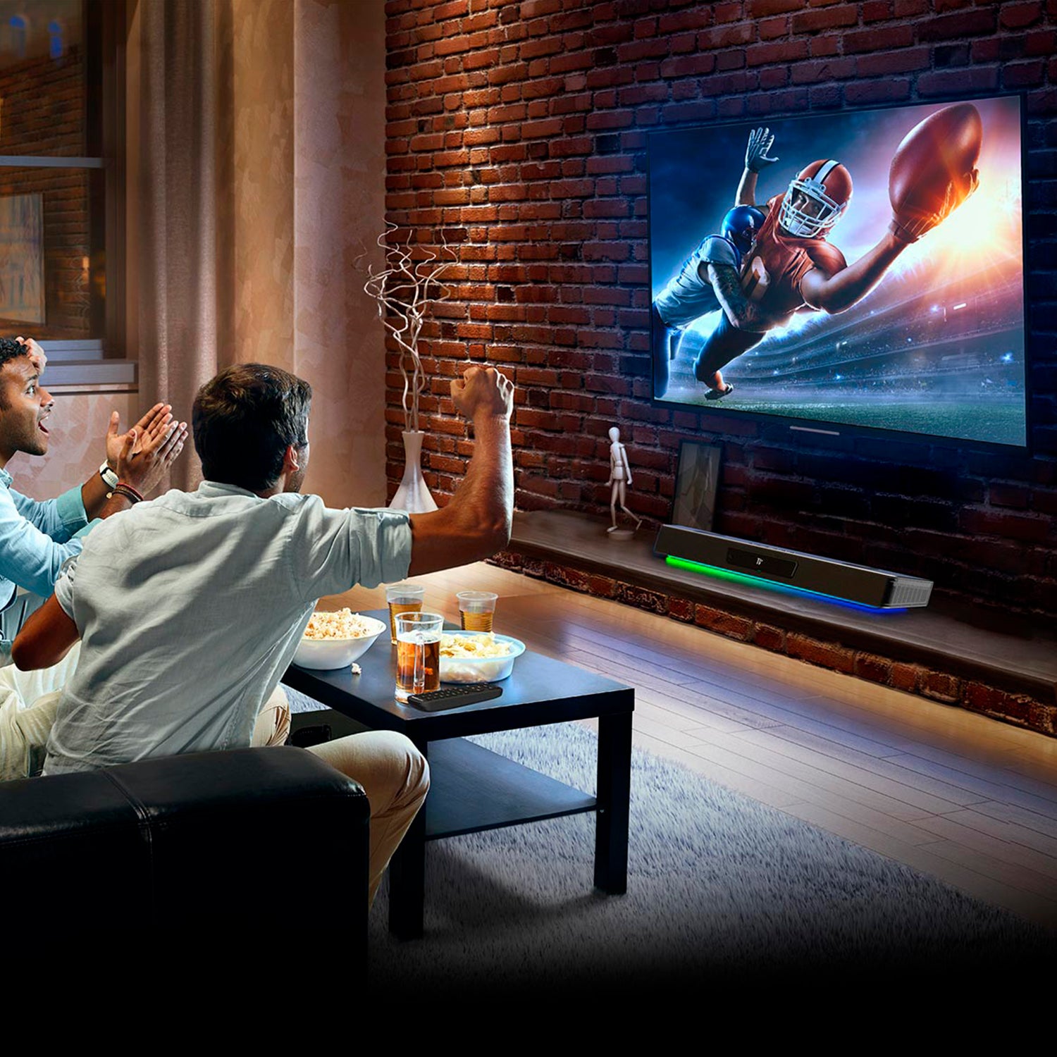 ¡Escucha los detalles en momentos más tranquilos o escenas de acción que simplemente te dejarán boquiabierto! Experimente el audio espacial inmersivo a través de nuestro galardonado diseño de cinco controladores triamplificado, la tecnología Super X-Fi® y la 5.1 virtual surround—, todo diseñado para la mejor experiencia de juego en la comodidad del hogar. La conexión también es perfecta con audio USB, conveniente HDMI ARC, etc Bluetooth® 5.0 tecnología para transmisión de audio inalámbrica, entrada óptica, salida SXFI y un AUX-in de 3.5 mm para audio analógico. La barra de sonido también viene con micrófonos de formación de haz incorporados duales si desea saltar rápidamente a una sala de chat en Discord con su equipo, o incluso para sus reuniones en línea.