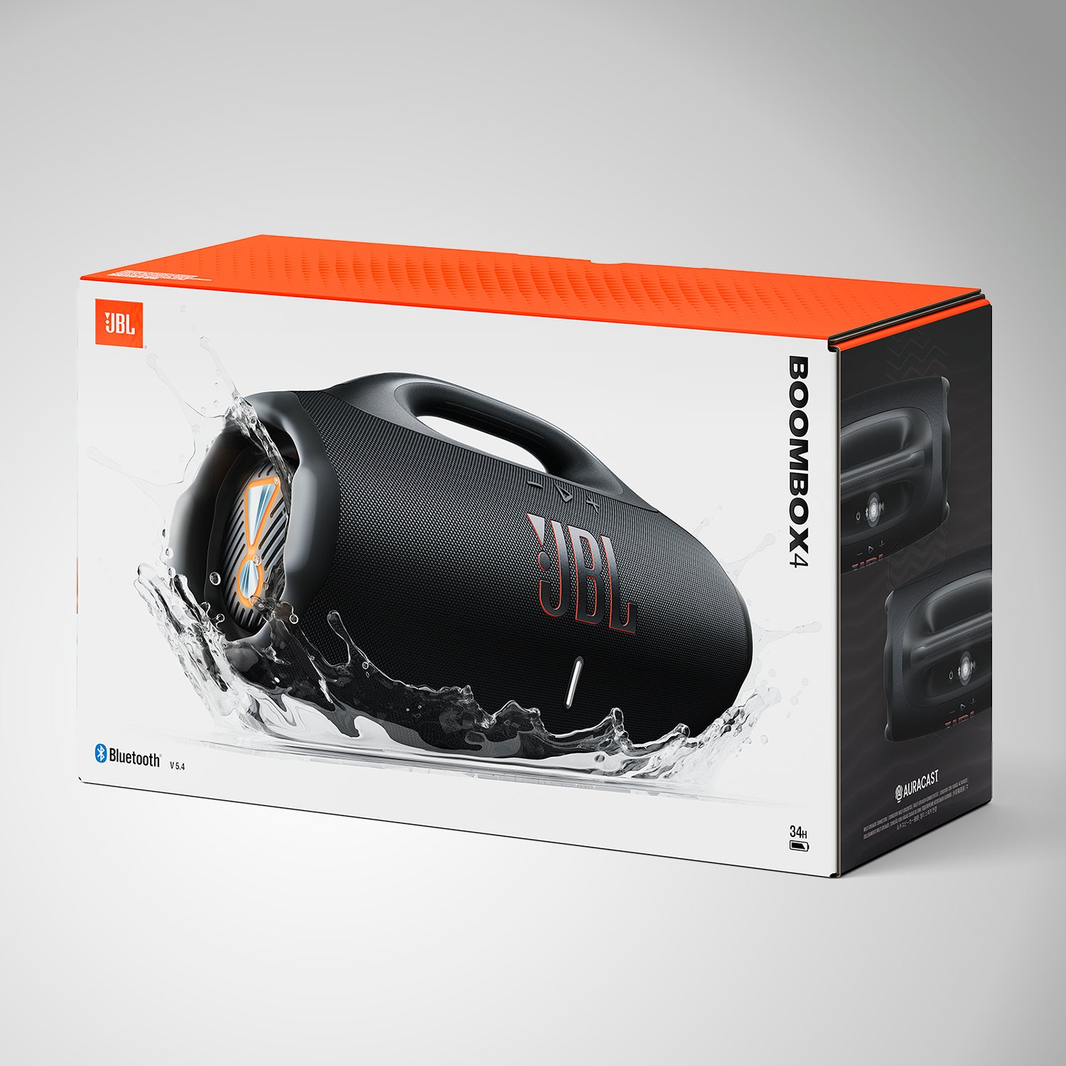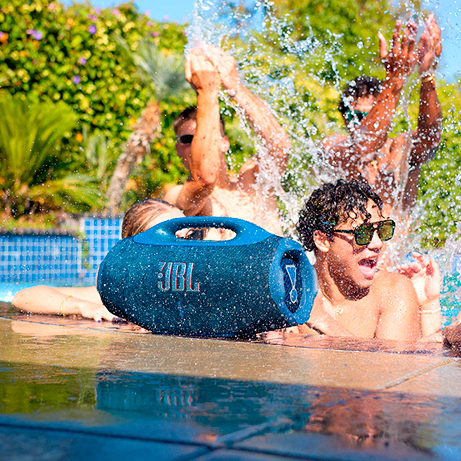 El JBL Boombox 4 es resistente al agua y al polvo con certificación IP68, así que puede soportar cualquier clima… o incluso a nuestros amigos más torpes.