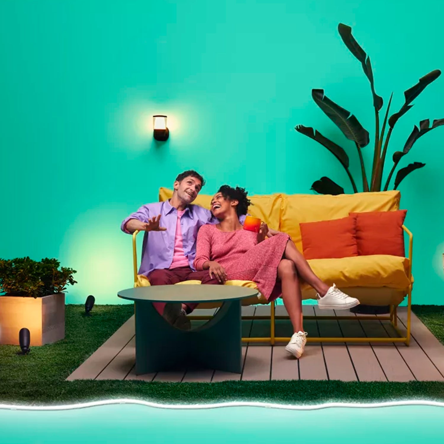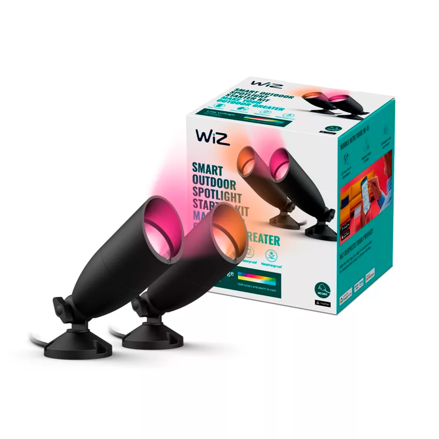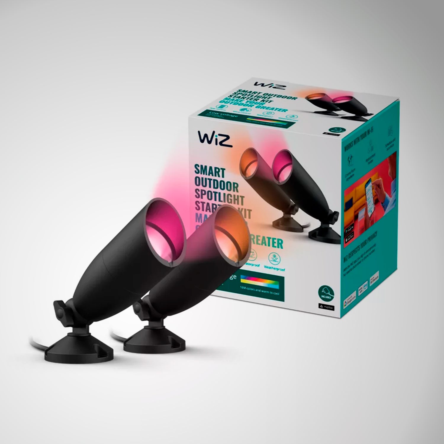 Esta luz WiZ para exteriores se ha sometido a rigurosas pruebas para garantizar un rendimiento óptimo en exteriores. Es capaz de soportar una amplia variedad de situaciones, desde luz solar extrema hasta aguaceros, vientos fuertes y aspersores de jardín.