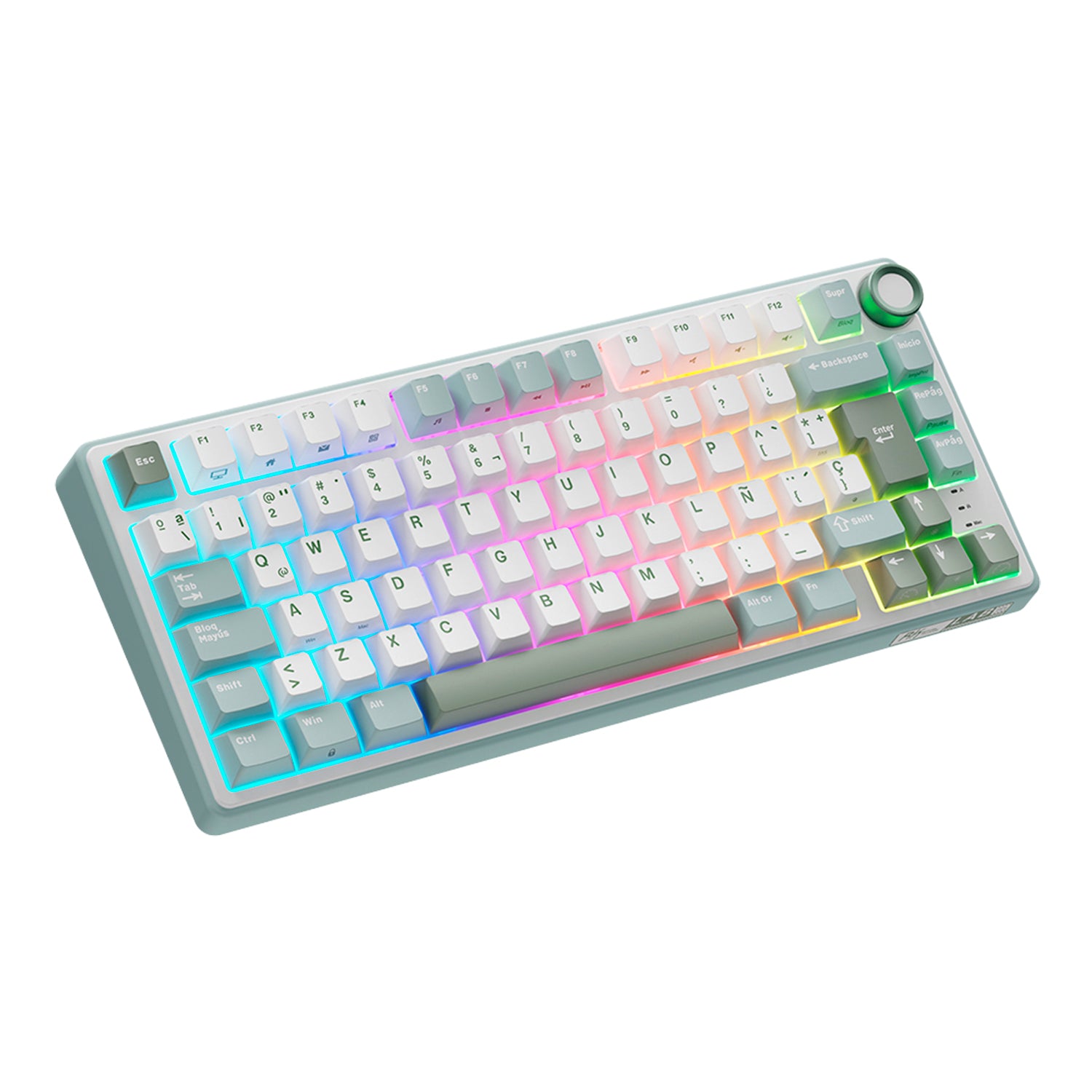 Teclado mecánico RK Royal Kludge R75 Blackberry con cable, distribución ISO en español y la letra Ñ, incluye perilla de volumen y retroiluminación RGB. Con una distribución del 75%, conserva las teclas de flecha y función esenciales mientras optimiza el espacio en tu escritorio.
