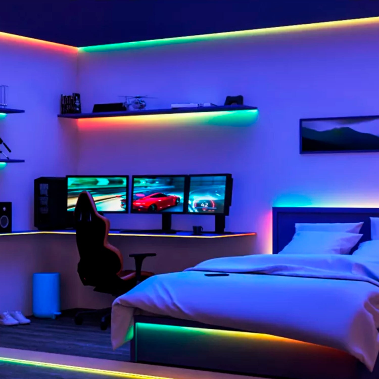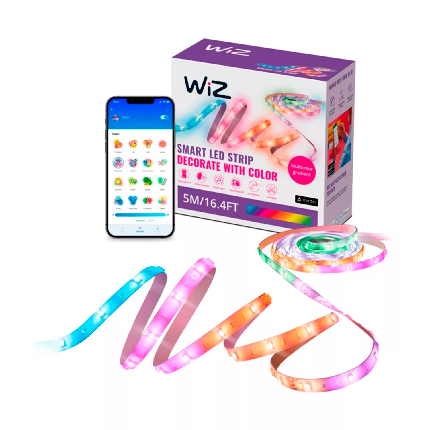 Nuestras tiras de luz RGBIC de 5 m se han diseñado para adaptarse a espacios de tamaño mediano y embellecerlos con más de 16 millones de colores planos. No te limites a los colores planos y ve más allá con segmentos a todo color que se pueden controlar individualmente para conseguir efectos deslumbrantes como arco iris, fundidos de color y destellos. Pega la tira flexible donde prefieras y utiliza la intuitiva aplicación WiZ para controlar las luces con la red Wi-Fi existente. Los modos de luz estática y dinámica, la regulación inteligente y la programación de la luz te permiten controlar todo el sistema, incluso cuando no estás en casa. Funciona con Google Home, Amazon Alexa y Apple HomeKit para ofrecer lo último en facilidad de uso.