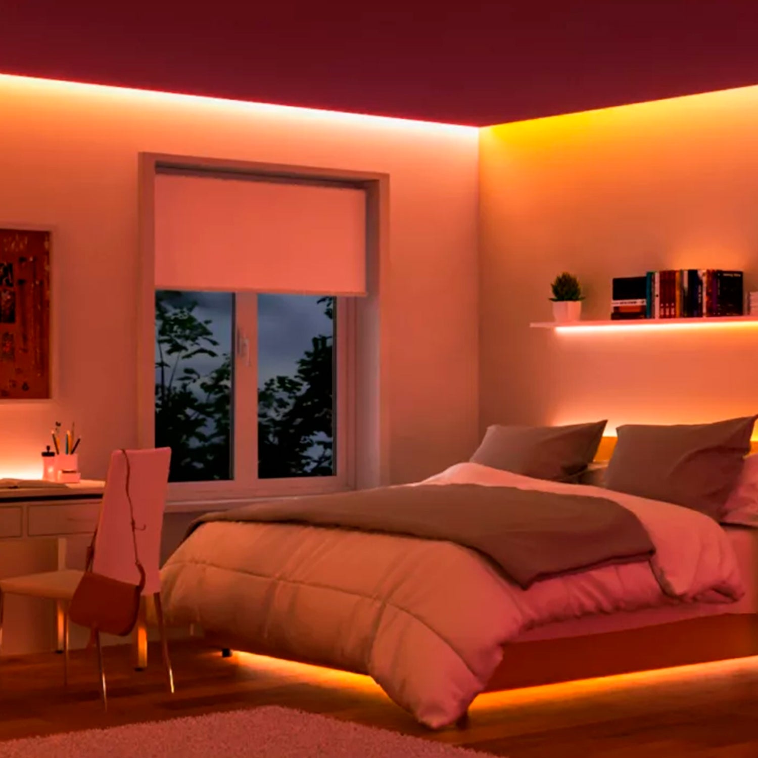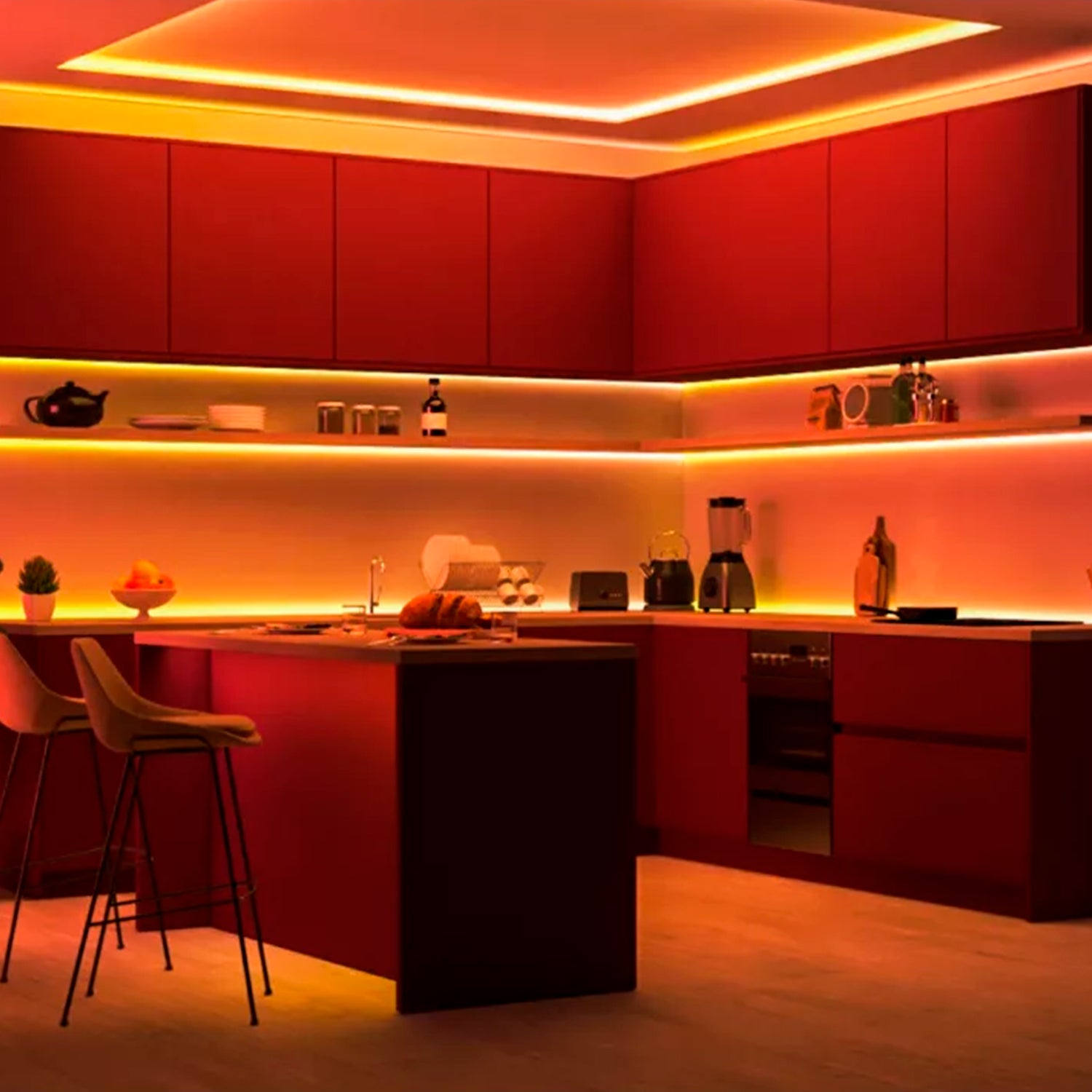 Basta con pegar la tira a cualquier superficie: escaparates, techos con bandeja, debajo de armarios e incluso a lo largo de bordes curvos. Añade bonitos acentos de color a tus muebles.