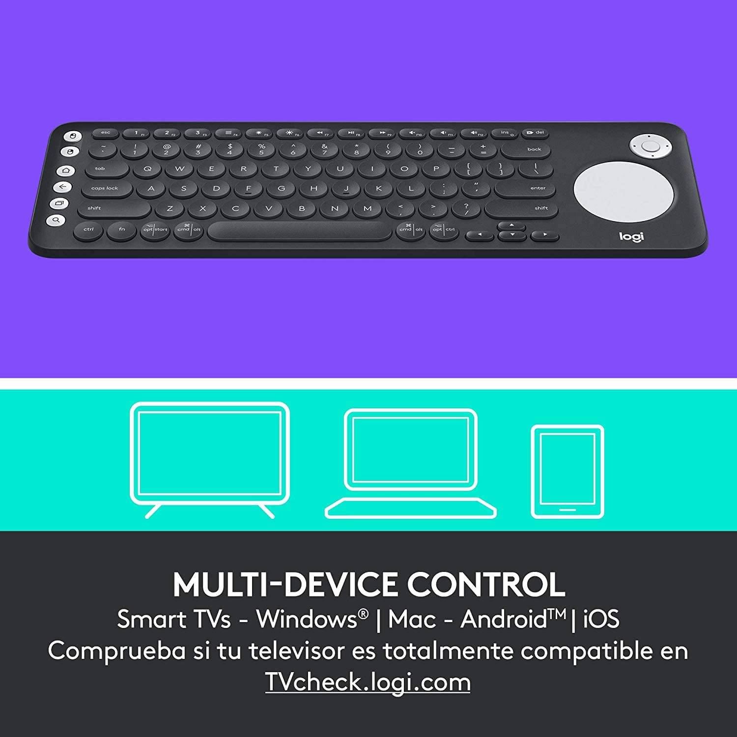 Busque un programa en su Smart TV, escriba un correo electrónico en su tableta y responda a un texto en su teléfono móvil desde un teclado. El K600 TV se conecta a su Smart TV, PC y dispositivos móviles – y cambia entre ellos con solo tocar un botón.