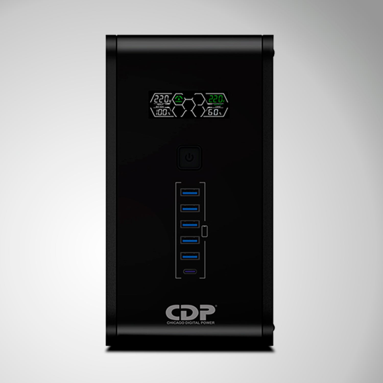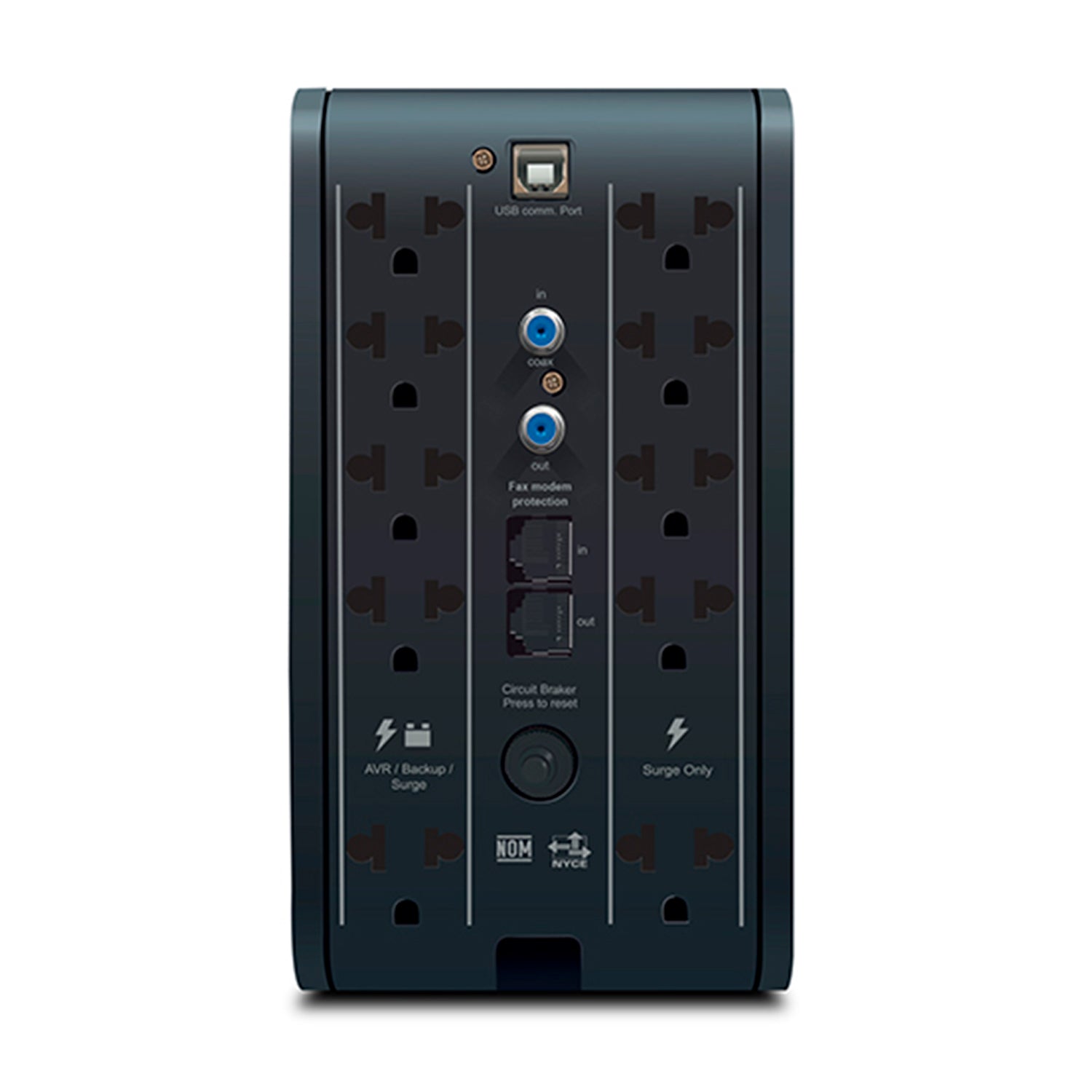 Es un UPS Inteligente (No Break) con diseño tipo minitorre con pantalla LCD y con un regulador de voltaje integrado de amplio rango de funcionamiento. Rango de Voltaje de Entrada: 154 -290Vca. Voltaje de Salida: 220Vca. Tomas de Salida: 5 con respaldo AVR y respaldo de batería + 5 con supresión de picos. Alarma Audible. Protección Fax, modem y DSL (RJ11 / RJ45), Protección de picos de voltaje (joules): 560 Joulles, . Tipo de Batería: 12 V / 7Ah, Número de Batería Interna: 2, Tiempo de Recarga (al 90%): 4 horas.