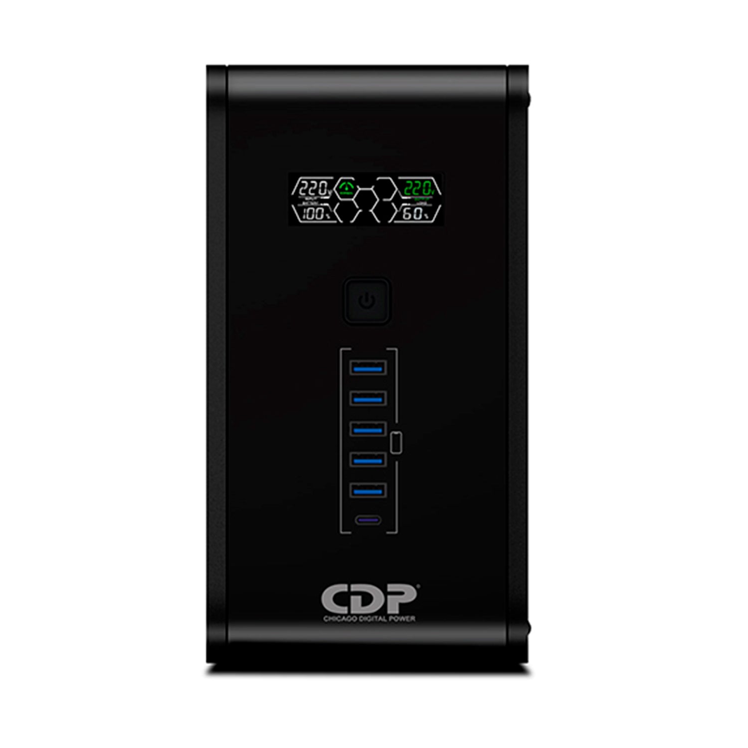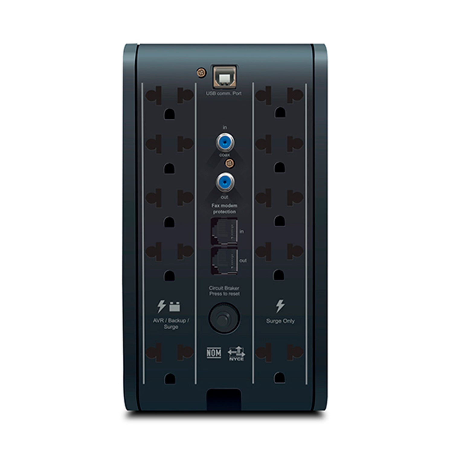 Es un UPS Inteligente (No Break) con diseño tipo minitorre con pantalla LCD y con un regulador de voltaje automatico (AVR) supresor de picos incorporado, puerto USB para recarga de celulares, tablets y dispositivos electronicos. Rango de voltaje de entrada: 154 - 290 VCA, 10 Salidas (NEMA 5-15R): 5 salidas con respaldo / AVR / supresion de picos + 5 salidas con supresion de picos, Cargadores USB: (5 USB-A / 1 USB-C), Proteccion de linea de datos: RJ11 / RJ-45, Breaker de proteccion de sobrecarga.