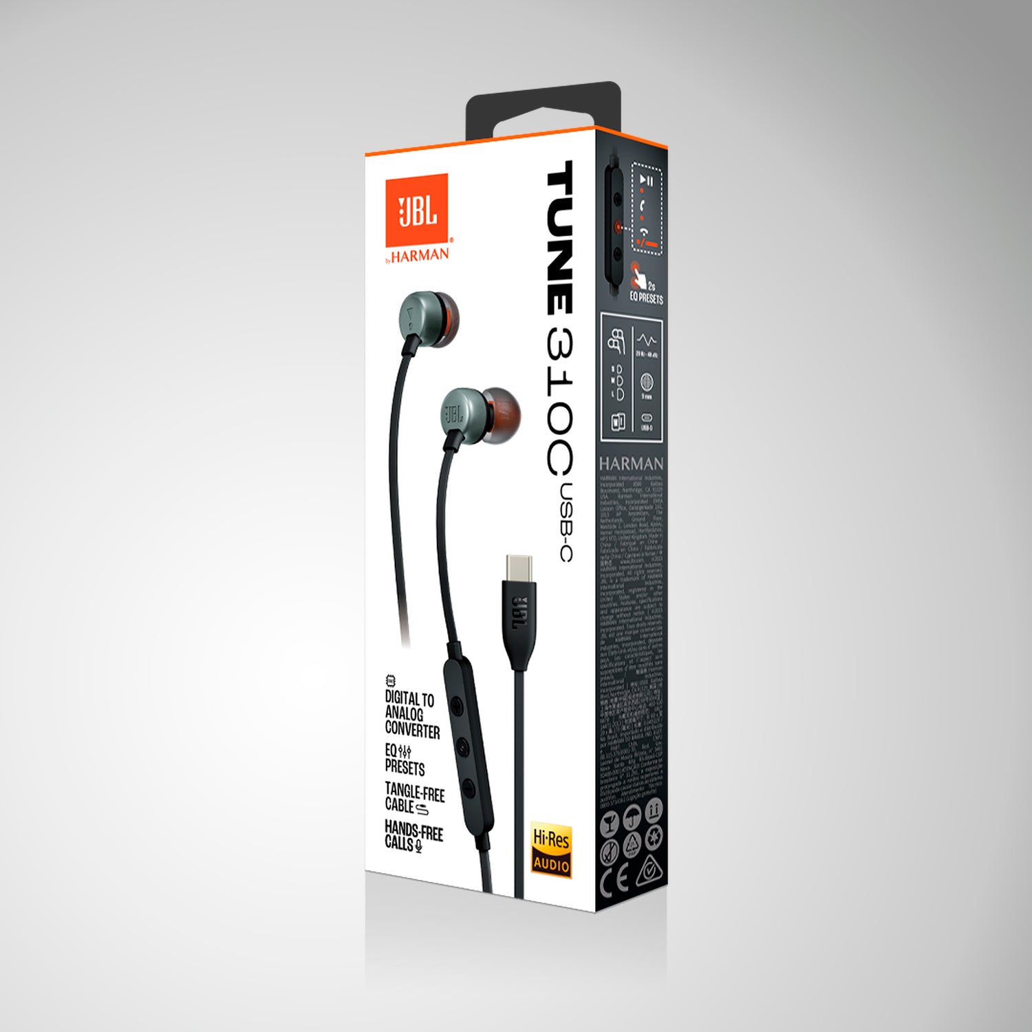 Sonido JBL Pure Bass con certificación de alta resolución, Compatible con dispositivos USB-C, Tres botones y micrófono y Control de preajustes EQ