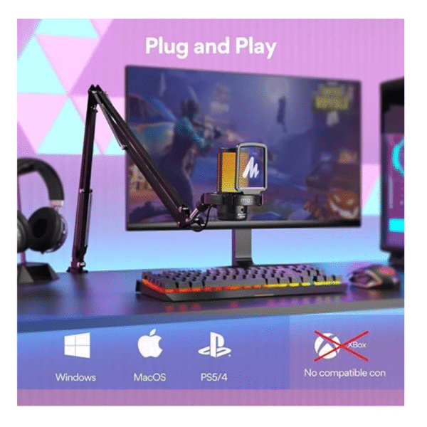 Incluye soporte metálico ajustable, shock mount y filtro pop, asegurando estabilidad y nitidez en tus sesiones de gaming, podcasting o streaming. Su conexión USB plug & play lo hace compatible con Windows, Mac, PS4 y PS5 sin necesidad de configuraciones complicadas.