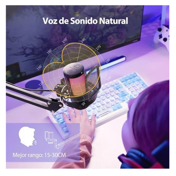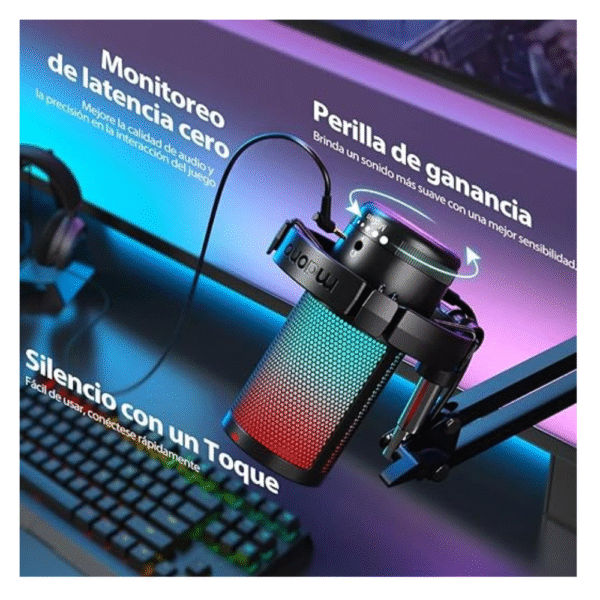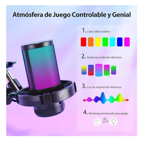 Con una frecuencia de muestreo de 24bit/48kHz, ofrece calidad de estudio en cada transmisión o grabación. Además, su iluminación RGB con 9 modos personalizables aporta estilo a tu setup gamer.