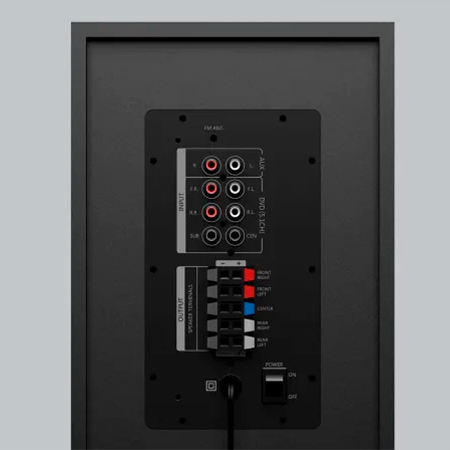 - Subwoofer con cable de alimentación fijo y antena de radio FM
