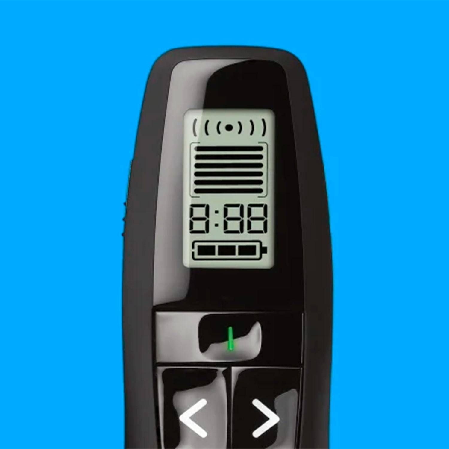 Con pantalla LCD de fácil lectura, puedes comprobar el tiempo restante y el nivel de carga sin que tu audiencia se dé cuenta. El remoto inalámbrico para presentaciones vibrará de forma silenciosa cuando se acerque el final para avisarte de que tienes que ir acabando.